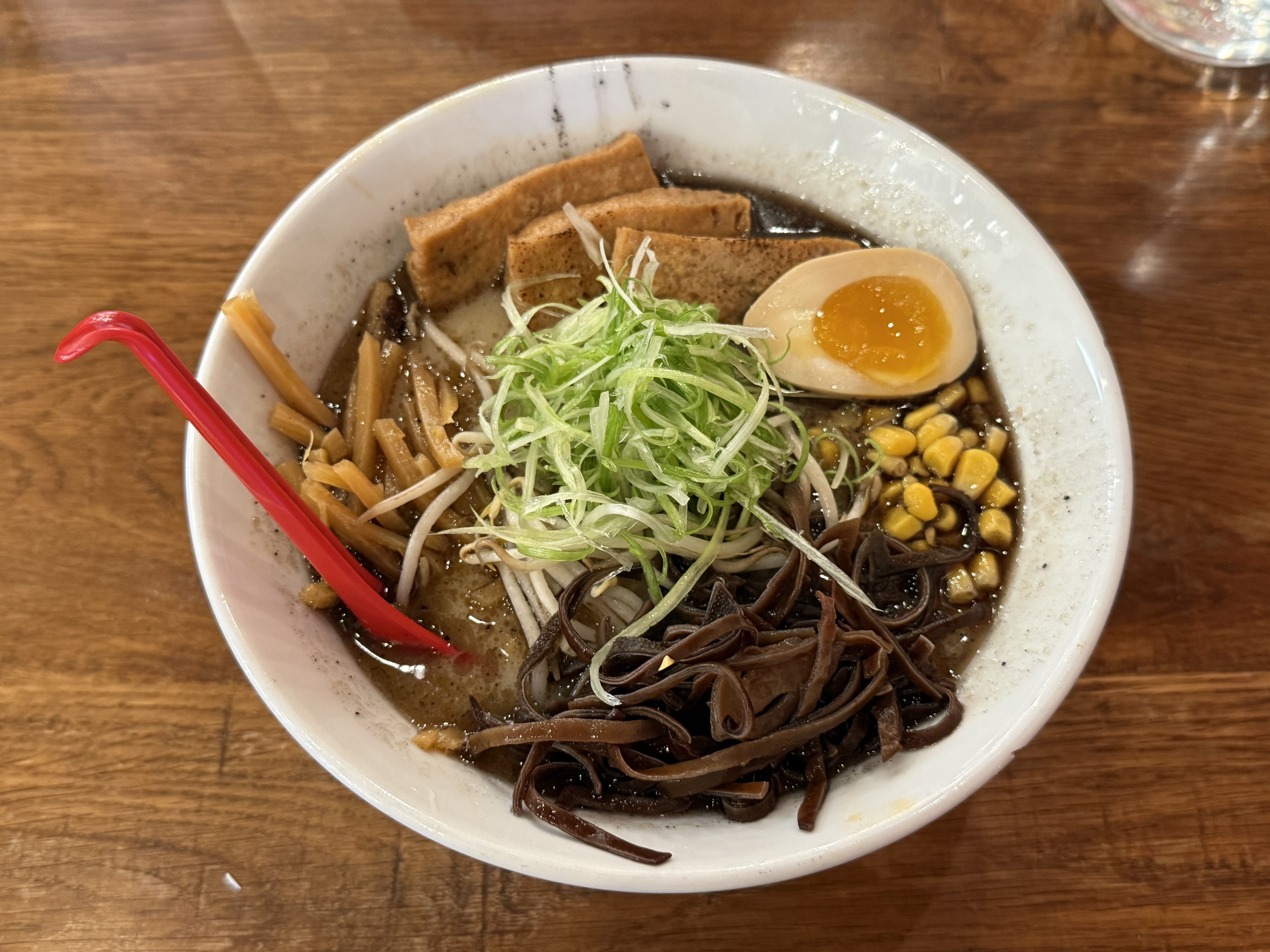 The broth had a tonkotsu flavor but was a bit thin and not served piping hot. The noodles had a chewy texture. I felt that corn didn’t really go well with it. The seasoned egg was flavorful, and the seasoned fried tofu I ordered instead of pork chashu was also well-seasoned and tasty.