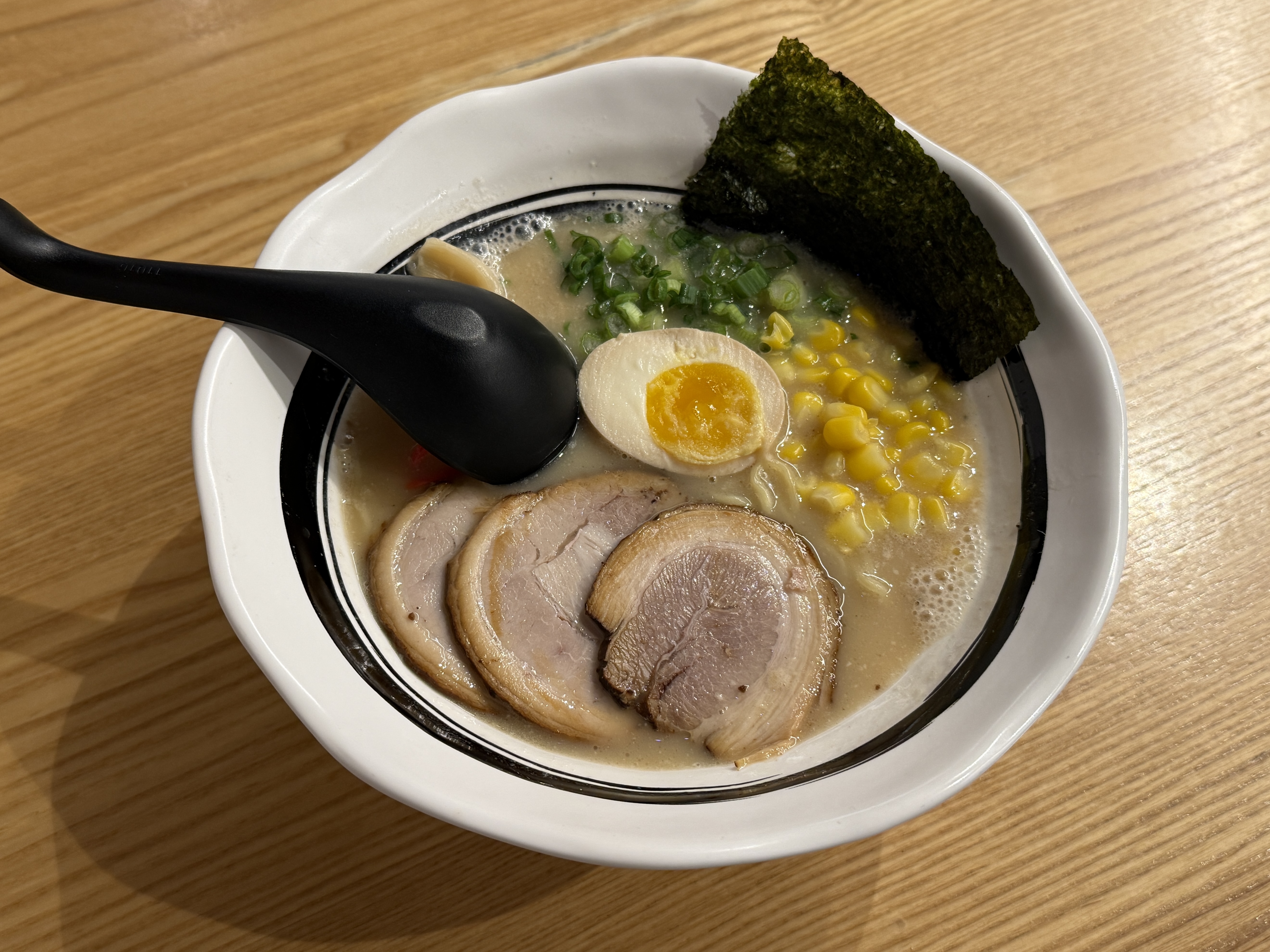 The most memorable part of the bowl was the soup. It was too creamy with a thick texture. However, there wasn't much the pork oil, and flavor was weak for a tonkotsu broth. The noodles reminded me of cafeteria-style ramen in Japan, with a slightly gummy texture that I didn’t really enjoy. I also feel that red pickled ginger and corn don’t go well with tonkotsu ramen. The bamboo shoots didn’t have much seasoning either.