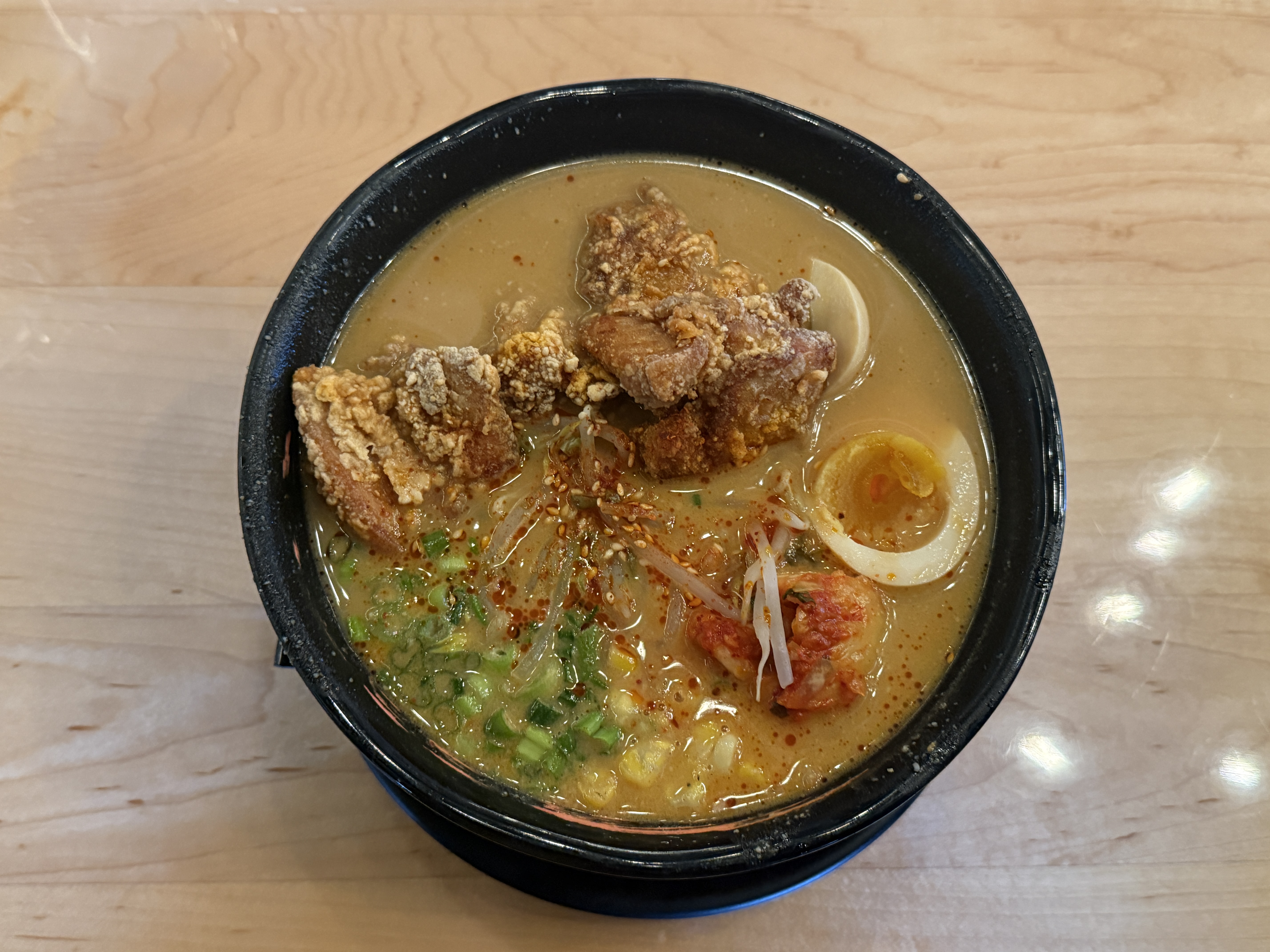 The Duck Fat Fried Chicken was absolutely delicious, and the thin noodles were great and matched well with the broth. The noodles were slightly stuck together, so I wish they had separated them before serving. The soup had kimchi in it, which added a bit of spice, and the rich miso flavor was really good. The other toppings were tasty as well.
