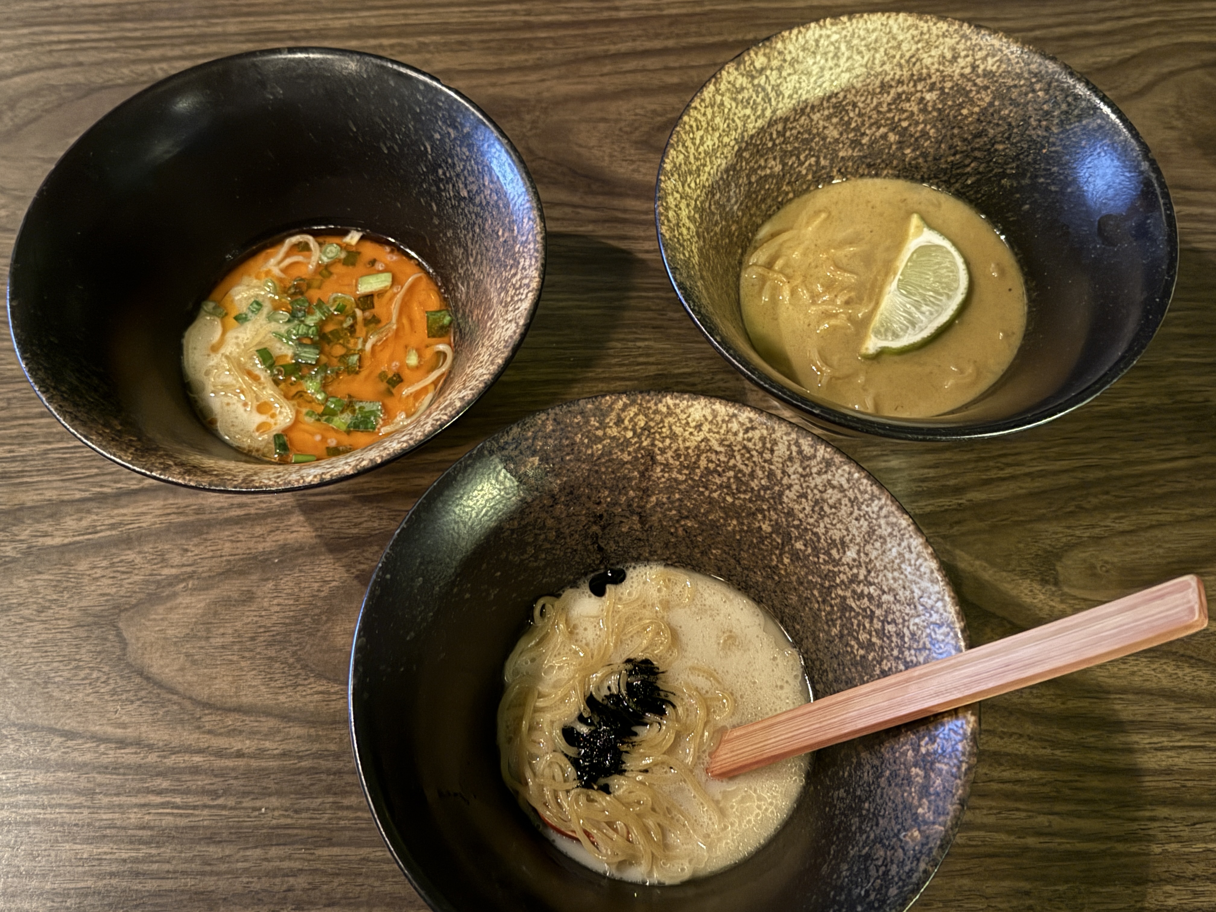 - Ingredients: Tonkotsu broth with black garlic oil, Thai broth with a lime wedge, Szechuan with aonori and scallions